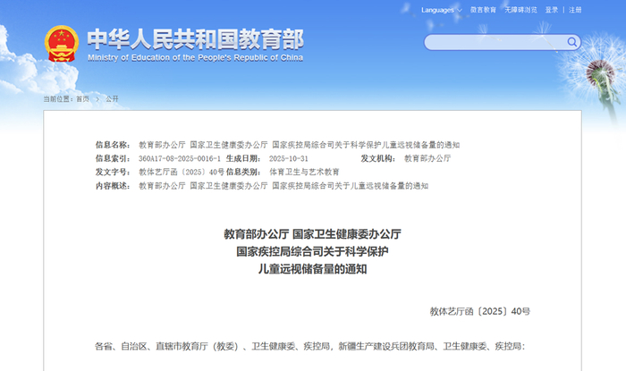 【环球网报道 记者 陈全 实习生 聂希子】记者近日从教育部获悉,为进一步推动幼儿园和小学全面落实《综合防控儿童青少年近视实施方案》《儿童青少年近视防控光明行动工作方案(2021—2025年)》《关于切实抓牢幼儿园和小学近视防控关键阶段防控工作的通知》,科学认识保护儿童远视储备量对于预防近视发生的重要意义,推动近视防控关口前移,多措并举保护儿童远视储备量,教育部、国家卫生健康委、国家疾控局联合就有关事项发布《关于科学保护儿童远视储备量的通知》(以下简称《通知》)。